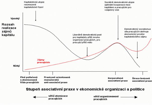 Proces sdružování pracujících je nezadržitelný, systém ho samovolné podporuje v rámci svých globalizačních tendencí. Nárùst intenzity demokracie a následné asociační síly pracujících nad jistou mez však začne snižovat schopnost kapitálu řídit investice a alokovat se. Další demokratizace společnosti pak narazí na vlastní zájmy kapitálu[28]. V tomto smyslu odmítají demokratičtí socialisté sociálné demokratickou utopickou iluzi, že je možno dlouhodobé garantovat soubéh zájmu kapitálu a pracujících.