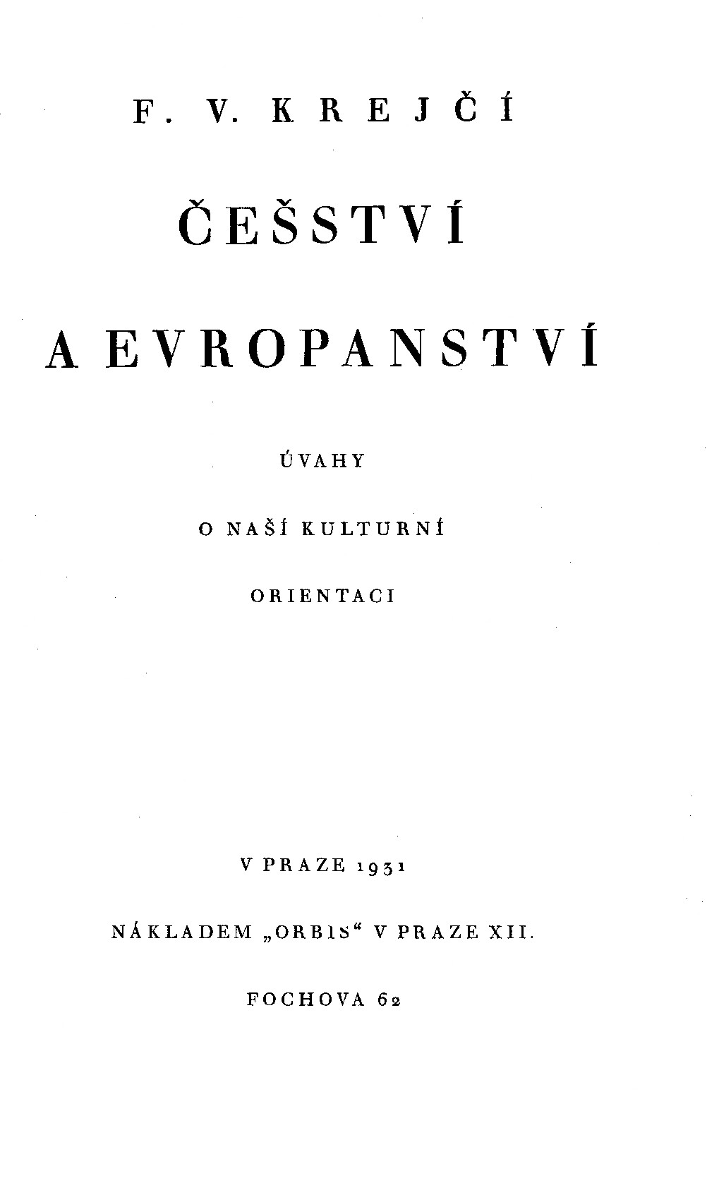 V roce 1931 vyšla v nakladatelství Orbis F. V. Krejčímu knížka "Češství a evropanství" s podtitulem "Úvahy o naší kulturní orientaci. V dnešní době, kdy dochází k rozšiřování Evropské unie a kdy se i my Češi chystáme na tento proces, klademe si otázky, co to pro nás může znamenat. Všichni cítíme svou sounáležitost s Evropou a bojíme-li se něčeho, jsou to spíše problémy socio-ekonomické. Přesto ale není Evropa homogenní ani po kulturní stránce, jak se již ostatně ukázalo vícekrát v minulosti. Sáhneme-li si navíc hluboko do své duše, nalezneme tam i zvláštní vztah k jazykově blízkým národům.