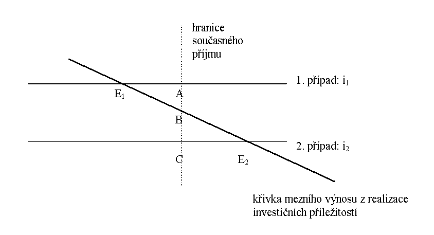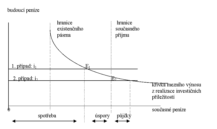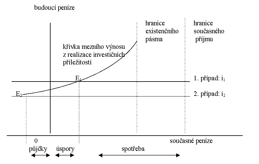 V prvním případě (úroková sazba = i1) je průsečík (bod E1) klesající křivky mezního výnosu z realizace investičních příležitostí s konstantní křivkou úrokové sazby před hranicí současného příjmu domácnosti (a tudíž i prostředků, kterými disponuje). To znamená, že poskytne-li své investiční prostředky k realizaci cizích investičních příležitostí, dosáhne vyššího budoucího příjmu, než pokud by realizovala vlastní investiční příležitosti. Spotřebuje (z hlediska teorie produktivní spotřeby se jedná o využití vlastních investičních příležitostí) tedy jen část disponibilních prostředků, zbylá část se stává úsporami (přenechává je k realizaci cizích investičních příležitostí). Křivku mezního výnosu z realizace jejích vlastních investičních příležitostí přitom můžeme interpretovat jako křivku poptávky po cizích investičních příležitostech.