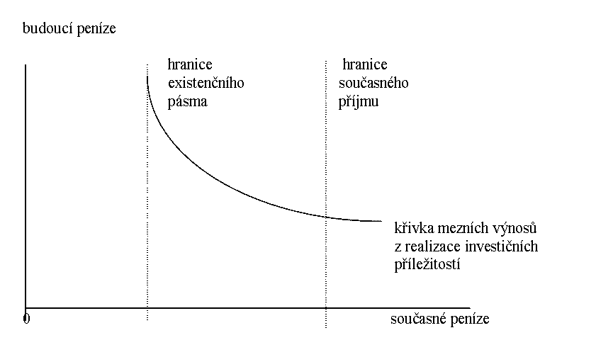 Část prostředků, kterými disponuje, využije pro realizaci vlastních investičních příležitostí. Samozřejmě, že nejdříve je použije k zajištění existenčních potřeb. Pokud se týká dalších investičních příležitostí, bude postupně přecházet od těch, které přinášejí největší výnosy, k těm, jejichž mezní výnos je nižší a nižší, dokud nevyčerpá zásobu investičních prostředků, kterou disponuje. Tak tomu bude v případě, dokud do hry nevstoupí kapitálový trh (schéma č. 1):
