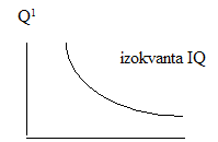 Křivka IQ (1. výstup) představuje jednu (z mnoha) izokvant, tj. křivek, které popisují různé kombinace 1. vstupu a 2. vstupu nutné k dosažení určitého množství 1. výstupu. Každému zadanému množství 1. výstupu odpovídá nějaká taková izokvanta. (Další taková izokvanta je naznačena čárkovaně a je rovněž konvexní ve vztahu k počátku 0 (1. výstup), zařazujeme ji do obrázku jen pro ilustraci a bez označení.)