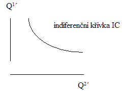 Křivka IC (2. spotřebitel) představuje jednu (z mnoha) jeho IC. Všechny tyto IC tvoří indiferenční mapu. (Další taková IC je naznačena čárkovaně a je rovněž konvexní ve vztahu k počátku, kterým je ovšem v zrcadlovém zobrazení roh 0 (2. výstup), v našem obrázku sehraje určitou roli.)