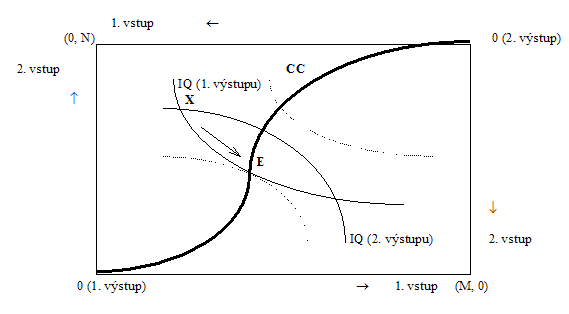 Spojíme-li všechny body na dotyku izokvant popisujících různé výstupy získáme tzv. smluvní křivku (CC), která je v grafu vyznačena tučně. (Důvod, proč se tato křivka nazývá "smluvní" bude zřejmé, až se budeme zabývat optimem ve směně.)