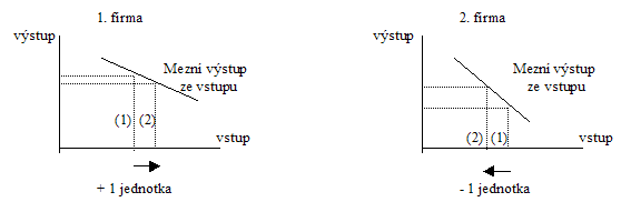 Máme grafické vyjádření mezního výstupu z 1. vstupu každé z firem (víme, že mezní výstup s každou další jednotkou vstupu klesá). Nechť v počátečním stavu (1) je mezní výstup 1. firmy větší než mezní výstup 2. firmy. Převodem jedné jednotky 1. vstupu z druhé firmy do první dojde ke zvýšení společného výstupu obou firem. Tak tomu bude až do té doby, dokud se mezní výstupy obou firem nebudou rovnat, tj. pokud nenastane stav (2).