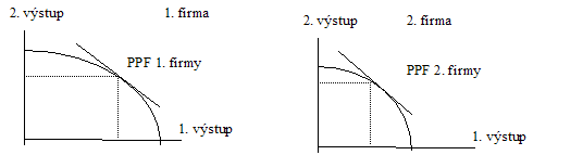 Stačí, když si uvědomíme, že sklon PPF v každém bodě (znázorněný tečnou) v případě obou firem vyjadřuje množství jednoho výstupu, kterého se musíme vzdát, pokud chceme zvýšit výstup druhý. Tento poměr (jak jsme si říkali již dříve) nazýváme mezní mírou transformace produktu (výstupu) - MRTP. Pokud by se mezní míry transformace produktu (výstupu) nerovnaly, lze zvýšit celkové množství produkce tím, že by jedna z firem vyráběla větší množství toho výstupu, u kterého je množství druhého výstupu, který musí obětovat, menší než u druhé firmy; druhá firma by pak zvýšila výrobu výstupu obětovaného první firmou.