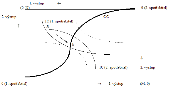 Výše uvedené tvrzení lze snadno dokázat. Pohybujme se po křivce IC (1. spotřebitel) z bodu X do bodu E (jak ukazuje šipka v grafu). Bod E je zajímavý tím, že se v něm křivka IC (1. spotřebitel) dotýká s jednou z IC popisujících preference 2. spotřebitele. Po celé trajektorii tohoto pohybu a samozřejmě i v bodě E je užitek 1. spotřebitele ze spotřeby obou výstupů stejný (protože se pohybujeme po indiferenční křivce), dochází jen ke změně kombinací výstupů, které jsou spotřebovávány. Vyčerpána je přitom vždy celá zásoba výstupů.