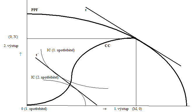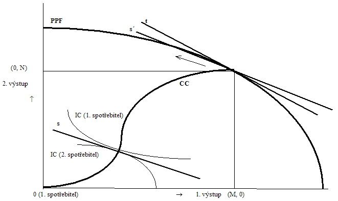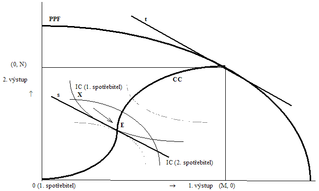 Klíčovou roli v něm hrají tečny s a t. První je společnou tečnou dotýkajících se IC obou spotřebitelů (a vyjadřuje nám již známou skutečnost, že mezní míra substituce obou spotřebitelů musí být shodná). Druhá je tečnou PPF v bodě dotyku krabicového schématu popisujícího směnu. O ní víme, že vyjadřuje mezní míru transformace.
