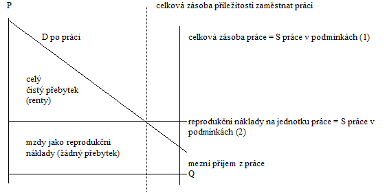Celková zásoba práce se nám pak rozdělí na zaměstnané a nezaměstnané, příjem z použití práce se dostane na úroveň reprodukčních nákladů a celý čistý přebytek si (v tomto případě v podobě renty) přivlastní vlastníci půdy.