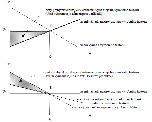 Co to znamená, že příslušný výrobní faktor není homogenní? Mohli bychom uvažovat různou interpretaci pojmu heterogenity. Poměrně jednoduché je to u výrobních faktorů, které vyžadují určité reprodukční náklady, tj. např. v případě práce. Zde můžeme pod heterogenitou chápat různou produktivitu a pod produktivnější jednotkou výrobního faktoru z existující zásoby práce rozumět tu, k jejíž reprodukci jsou potřebné nižší náklady. Z tohoto hlediska je pak zřejmé, jak může vlastníkovi práce vzniknout určitý čistý přebytek. Podobně i u kapitálového statku můžeme za produktivnější považovat ten, jehož jednotku lze pořídit za nižších nákladů či k jehož provozování jsou nutné nižší náklady. Záleží potom na tom, jaké příležitosti zaměstnání pro daný výrobní faktor vytváří jeho spojení s druhým výrobním faktorem. Podle toho se rozhodne o tom, která část výrobního faktoru bude zaměstnána, do jaké míry produktivity a jaký čistý přebytek vlastníkovi produktivnějších výrobních faktorů vznikne.