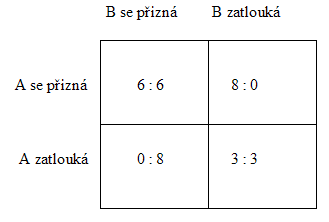 Jedná se o následující: Jsou chyceni dva podezřelí (A a B), ale důkazů proti nim není dostatečně. Každý z nich se může buď přiznat, nebo zatloukat. Možné situace popisuje následující tabulka možností: