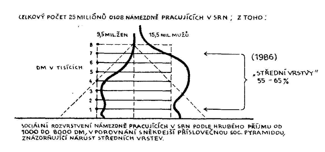 Někdejší znázornění sociálního rozvrstvení společnosti pyramida, je už jen pouhým symbolem, skutečná skladba vyspělé společnosti vypadá jinak. Na několika příkladech z Německa to ukazuje tabulka.