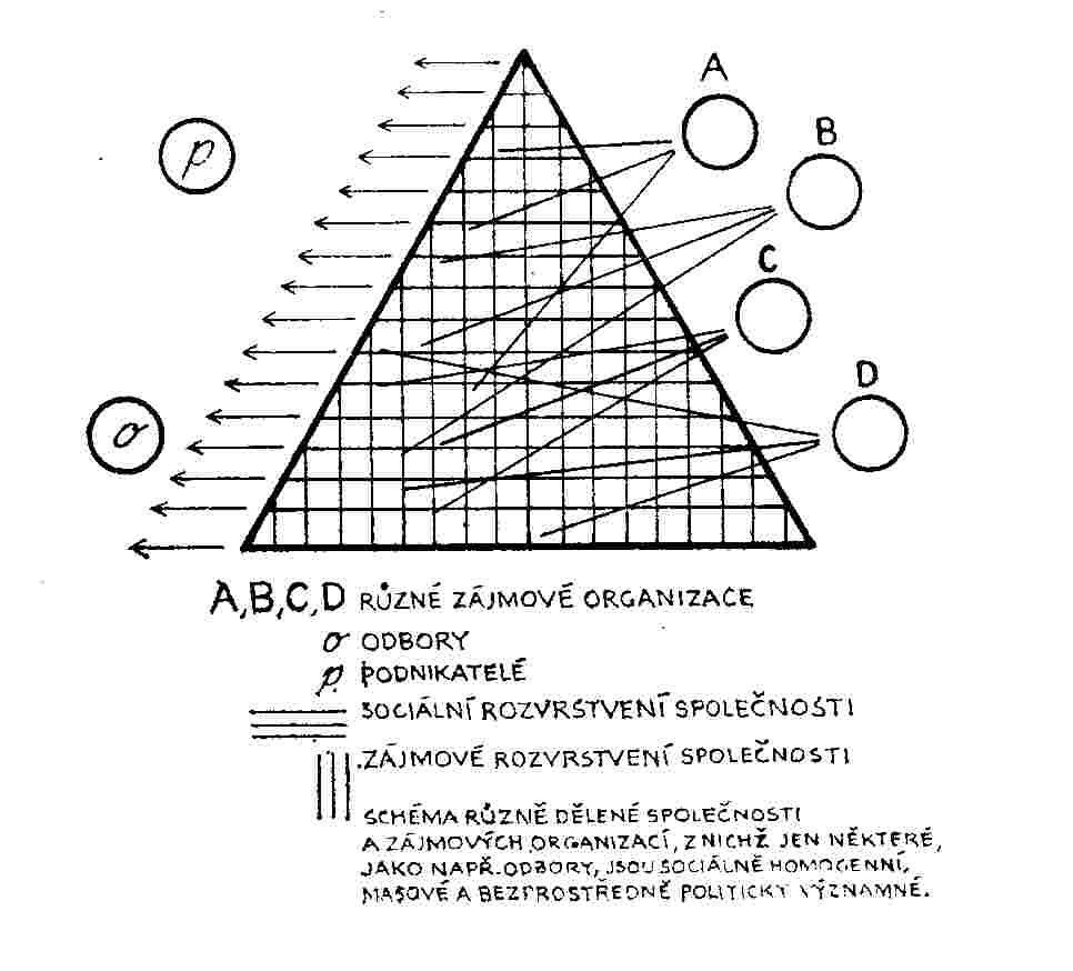 Společenské pyramidy nejsou ovšem rozděleny jen horizontálně na společenské třídy nebo vrstvy, nýbrž současně i vertikálně, podle jiných, nejen sociálních měřítek. Takto rozvrstvená společnost hledá sama přirozené vazby například na zájmové organizace a spolky s nejrůznější orientací jak tradiční (spolky kulturní, sportovní, náboženské apod.) či generační (pro mládež nebo naopak pro seniory) nebo „moderní” (ekologické, feministické a jiné), ale i na organizace se zaměřením sociálně hospodářským (odbory, živnostníci, zaměstnavatelé).