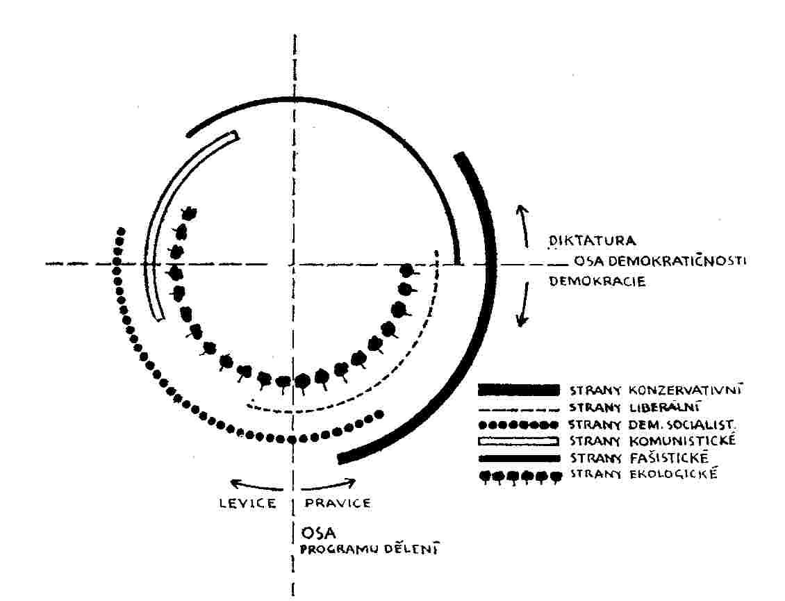 Jednotlivé strany lze těžko při jejich dělení klást horizontálně vedle sebe, překrývají se názorově i programově, mizí postupně klasické rozdělení na pravici a levici, snad nejpřehlednější je rozdělení do růžice podle dvou souřadnic: podle osy vnitřní i vnější demokratičnosti na strany s trendem buď spíše demokratickým či autoritativním (nebo diktátorským) a podle osy programového dělení na strany „levicové” (s propracovanějšími sociálními cíli, s větším sklonem k etatismu apod.) a „pravicové” (zdůrazňující spíše odpovědnost jedince za sebe sama a diktát trhu jako téměř všerozhodující element...).