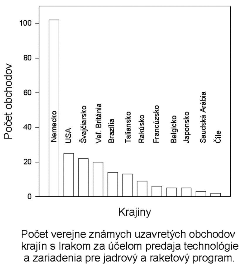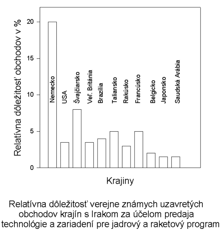 Na obrázku č. 1., ktorý je urobený z údajov v článku [21], je ukázaných 12 štátov, ktoré najviac pomáhali vyzbrojiť Irak v jeho jadrovom a raketovom programe. Z obrázku vidieť, že najviac obchodov uzavrelo Nemecko (102), zhruba 3-krát viac ako ostatné krajiny. Ïalšie krajiny, ktoré nie sú zobrazené na obrázku a u ktorých počet obchodov s Irakom bol menší ako 3 je nasledovný: Egypt (2 obchody), Juhoslávia (2), Argentína (1), Řína (1), Grécko (1), Lichtenštajnsko (1), Nigéria (1), Po¾sko (1), Portugalsko (1), ZSSR (1), Španielsko (1) a Švédsko (1). Řlánok taktiež udáva relatívnu dôležitosť vojenských obchodov v percentách pre jednotlivé krajiny. Údaje sú vynesené na obrázku č. 2, podiel Nemecka je tiež najvyšší. Podiel ostatných krajín, ktoré nie sú na obrázku bol 2.5% alebo menší. Zaujímavé je, že predávajúce firmy často neboli výrobcovia a predávali inde zakúpené zbraòové komponenty.