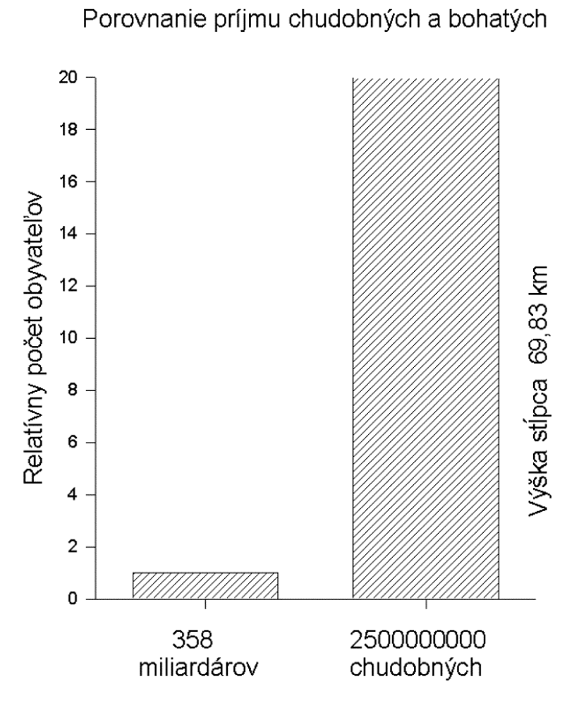 Rovnaký majetok ako 358 miliardárov postavených na seba, ktorý by sa zmestili do ståpca vysokého 1 cm, má majetok 2.5 miliardy najchudobnejších ¾udí na svete, čo predstavuje výšku ståpca 69,83 km. Rád by som vedel ako by vyzeral tento graf keby sa porovnal majetok 358 najbohatších a 2.5 miliardy najchudobnejších ¾udí sveta, napríklad v roku 3000 pred našim letopočtom, počas rímskeho impéria, v stredoveku, v čase Francúzskej revolúcie v 19. storočí, v roku 1930, alebo predpoklad na rok 2050? Zaujímavé, že aj z čísel ukázaných na obrázku č. 3. profesionálna propaganda KGI dokáže argumentovať, že vo¾ný trh funguje spravodlivo a prináša približne rovnako progres na celom svete.
