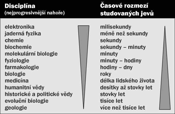 Pořadí vědeckých disciplín seřazených podle jejich úspěchů (praktických aplikací, počtu publikací, míry pokroku a rozvoje v průběhu staletí apod.) koreluje velice dobře s velikostí časové škály, ve které se uskutečňují (tab. dole). Existují samozřejmě výjimky a komplikace, když např. rychlý vědecký objev v technologii může být najednou aplikován v "dlouhodobé" disciplíně, jako je astronomie a geologie. Zásadní roli hraje rychlost procesů, které jsou studovány.