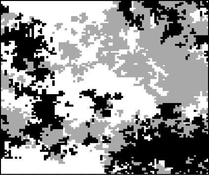 Kritický bod Isingova modelu má jednu význačnou vlastnost, která nás bude zajímat. Domény totiž získávají fraktální tvary, což se matematicky projeví tím, že korelace mezi jednotlivými místy klesají se vzdáleností jako nějaká mocnina. Mocninné závislosti různých veličin bývají velmi často neklamným znamením, že se zde vyskytují fraktální struktury. A právě s tím jsme se setkali u Sznajdova modelu (viz obr. 2).