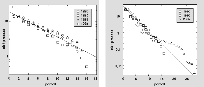 Přirozeně se nabízejí otázky: „A co u nás?” „Jak je to v České republice?” Údaje z několikerých posledních parlamentních voleb jsou volně přístupné na Webu, můžeme je tedy vynést do grafu, stejně jako to udělali badatelé v Brazílii. Body odpovídající trojím posledním volbám jsou skutečně všechny nahloučeny kolem přímky, která odpovídá rozdělení podle vzorce 1/x pozorovaného v Brazílii (viz obr. 1). Souhlas sice není nijak zvlášť kvalitní, přesto však je zřejmé, že všechny poslední volby dávají dosti podobné výsledky (ačkoli odpovídajícím bodům přísluší většinou úplně jiné strany), a tedy za nimi s největší pravděpodobností bude jeden společný mechanizmus. Tuto hypotézu ještě více podporuje soubor dat z parlamentních voleb za první republiky (rovněž obr. 1). Výsledky všech prvorepublikových voleb se opět shlukují kolem společné přímky, ta je však odlišná od přímky odpovídající volbám z posledního desetiletí. Z toho můžeme usoudit, že odlišný volební systém první republiky (např. neexistence pětiprocentního prahu) vede k jinému rozdělení, ale v rámci téhož volebního systému je mechanika voleb tatáž bez ohledu na to, které strany se jich účastní a jaké bylo jejich výsledné pořadí.