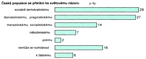 Výzkum Klubu sociologů a psychologů uskutečněný před několika týdny mezi téměř sedmi sty občany ČR v souboru odpovídajícím reprezentativnímu složení dospělé populace přinesl aktuální informace. Použili jsme novou charakteristiku s více alternativami světového názoru, která není zcela přesná z hlediska filozoficko sociologického pojetí, přesto je srovnatelná s dřívějšími výzkumy. Šlo zejména o zařazení tzv. „sociálně demokratického světového názoru”. To umožnilo zachytit současnou tendenci příklonu občanů k sociálně demokratickým ideovým tendencím.