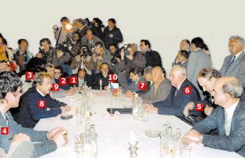 1 - Michal Horáček, 2 - Alexander Vondra, 3 - Martin Mejstřík, 4 - Václav Malý, 5 - Marián Čalfa, 6 - Ladislav Adamec, 7 - Vasil Mohorita, 8 - Václav Havel, 9 - Václav Klaus, 10 - Michael Kocáb |