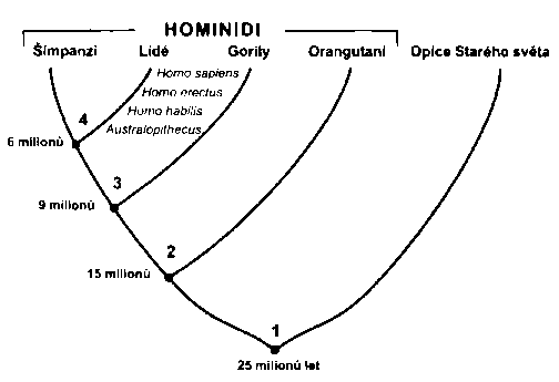 Za mých studentských dob počátkem šedesátých let jsme se v antropologii učili, že člověk se od lidoopů odtrhl přinejmenším před 20 miliony let. To nám nejen poskytlo čas, abychom ztratili srst, aby se nám zkrátily paže a abychom se stali dvounožci, ale naši předkové měli také dost a dost času na vyvinutí oněch „výlučných lidských atributů” - myšlení, jazyka a civilizace. V mých vysokoškolských učebnicích vypadá rodokmen lidoopů tak jako schéma na následující straně.