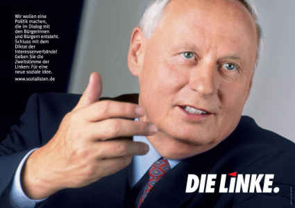 Gysi s sebou tahá knihy, volební časopisy a letáky, přičemž Lafontaine je podepisuje. Mimo jiné znovu onen plakátový motiv hrbícího se Gysiho ve formátu poštovního lístku: „Tahle blbá fotka”, vyklouzne Gysimu. Kdybych ji byl viděl dřív, nebyla by schválená”. Volební manažer Bodo Ramelow prý zkoušel před publikem různé motivy. „Tenhle obrázek měl nejsilnější reakce, to šla sálem úplná vlna”, zdůvodnil své rozhodnutí. Přesto však byl tenhle obraz po celém Německu minulý týden přelepen. Na Západě teď uvidíte jen Lafontaina a na Východě jen Gysiho. (Pro českého čtenáře přinášíme obrázky obou billboardů - ZDE a ZDE.)