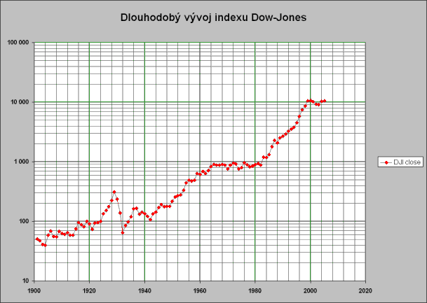 S výjimkou nestability kolem krachu NY burzy si všimněte střídání zhruba dvacetiletých období růstu (40.-50. léta, 80.-90. léta) s obdobími stagnace (20.-30. léta, 60.-70. léta). Všimněte si i možných psychologických obtíží při překonávání hodnot DJ indexu na hladinách 100, 1000 a dnes 10 000. Odvážnou extrapolací historie můžeme dnešní situaci interpretovat jako první pětiletku dalšího dvacetiletí hospodářské stagnace.