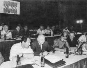 Pohled na předsednictvo památného sjezdu čs. spisovatelů v roce 1967. V. Bižak a J. Hendrych mezi spisovateli