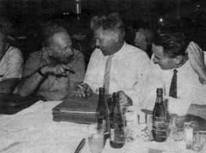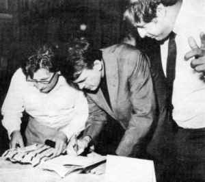 Snímek tří z nejaktivnějších účastníků sjezdu čs. spisovatelů v roce 1967 zleva: L Vaculík, M. Kundera a I. Klíma