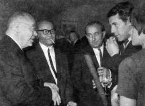 Vedoucí funkcionáři rádi setrvávali v srdečných rozhovorech s umělci na snímku tak činí J. Hendrych, J. Dolanský a V. Slavík s M. Formanem