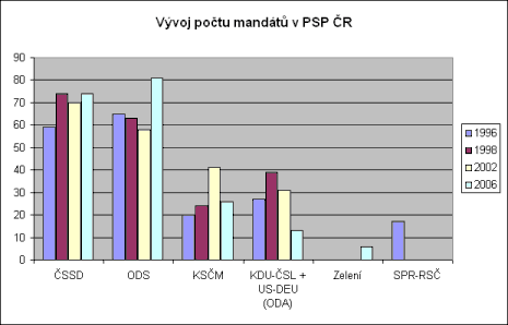 Podívejme se nyní na parlamentní volby z historické perspektivy. Rozložení sil v PSP ČR se v posledních deseti letech měnilo následovně: