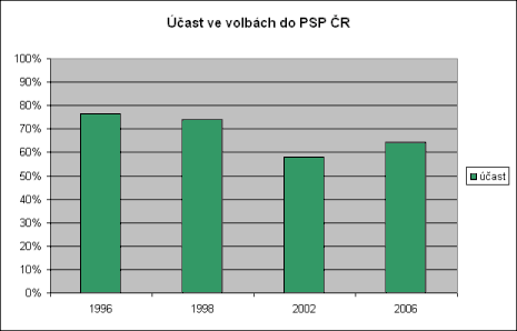 Při bližším zkoumání však nesmíme opomenout jiný významný faktor, kterým je volební účast. Její vývoj připomene další graf: