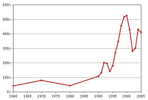 Dalším způsobem, jak použít příjem jako indikátor moci, je srovnávat průměrný roční příjem generálních ředitelů s průměrnou mzdou továrního dělníka, něco co už děla Business Week řadu let. Poměr výplaty generálního ředitele k továrnímu dělníkovi vzrost z 42:1 v roce 1960 až na 531:1 v roce 2000, tedy na vrcholu bubliny akciových trhů, kdy generální ředitelé kasírovali z opcí velkých akcií; v roce 2005 to bylo 411:1. Jen pro porovnání - ten samý poměr v Evropě je 25:1. Změny tohoto poměru v Americe jsou zobrazeny na Obrázku 6.