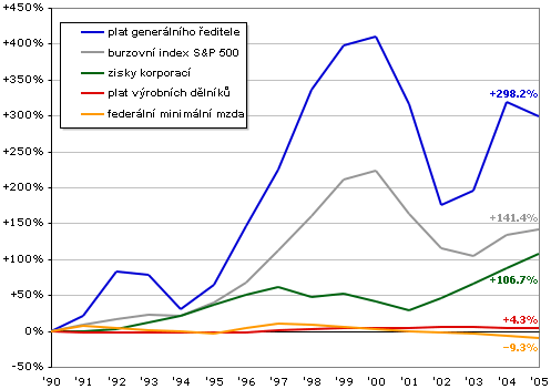 Porovnání aktuální rychlosti růstu platů generálních ředitelů a řadových dělníků je snad ještě více odhalující; mezi roky 1990 a 2005 vzrostly platy generálních ředitelů o téměř 300% (opraveno o inflaci), zatímco plat dělníků vzrostl o pouhá 4,3%. Kupní síla federální minimální mzdy přitom ve skutečnosti poklesla o 9,3%, vezmeme-li do úvahy inflaci. Tyto zarážející výsledky jsou ilustrovány Obrázkem 7.