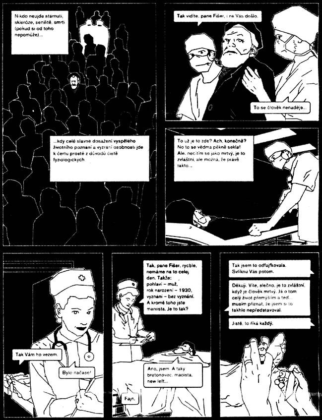 „Téma smrti jste si ve svých pracích vychutnával často,” připomínám taktně-netaktně, když vidím, že se zastavil na stránce, kde komiksový ilustrátor vykreslil Bondyho, kterak je na nemocničním lůžku odvážen na patologii (v typickém baretu a zimním hubertusu, ale už bez bot - holé nohy mrtvého vylézají zpod bílého lajntuchu). Text v bublině říká: Tak vidíte pane Fišer, i na Vás došlo. V dalším okénku se Bondy obrátí k sestřičce: Víte, slečno, je to zvláštní, když je člověk mrtvý. Já o tom celý život přemýšlím a teď... musím přiznat, že jsem si to takhle nepředstavoval.