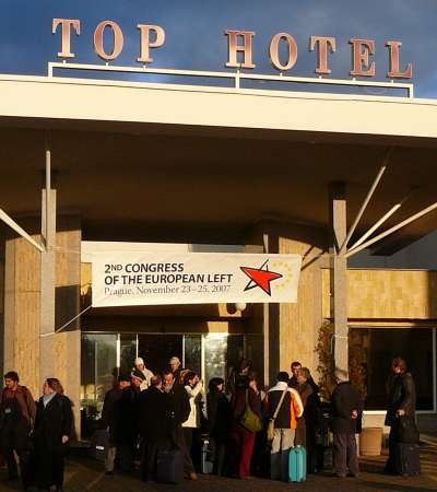 Tahle vítal účastníky 2. sjezdu Evropské levice TOP hotel na Praze 4.