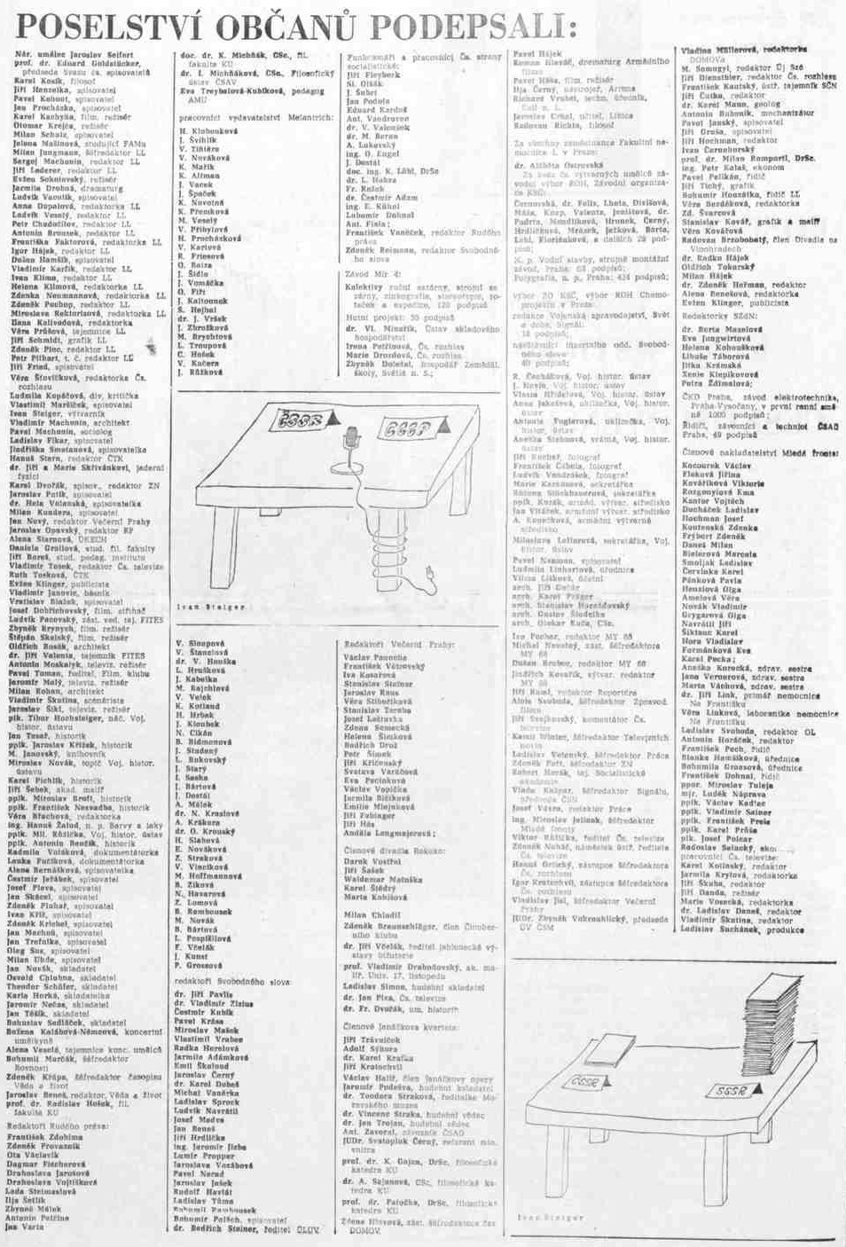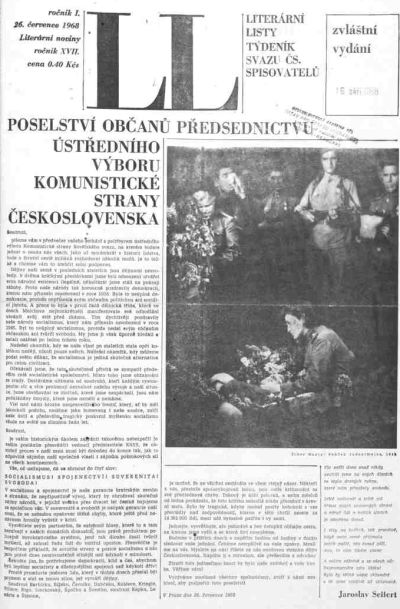 26. července 1968 vy¹lo zvlá¹tní číslo Literárních listù s textem, který mél podpořit československé vedení před setkáním se sovétskými představiteli v Řierne pri Řope. Autor textu Pavel Kohout (patrné inspirovaný Josefem Smrkovským) ho nakonec také spolu s Jiřím Hanzelkou přečetl v Řeskoslovenské televizi. Text poselství podepsalo údajné přes milion občanù - první signatáři byli zveřejnéni spolu s textem v mimořádném vydání LL - díky tomu se mohou jevit dne¹ní protisocialistické postoje nékterých z nich dost legračné. (mn)Soudruzi,