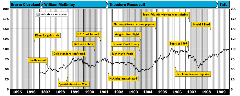 Právě jsme minuli období 1. světové války, založžení Fedu i bolševickou revoluci. Obrázek se stále nemění. Kdyby se smazala data a jednotlivé události, stěžží byste od sebe obě období rozeznali. Ale teď to přijde: