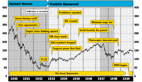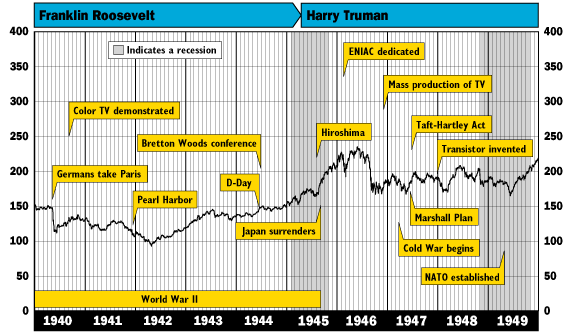 Všimněte si, žže po počátečním oslabení indexu z 380 na 200 burza půl roku bojuje, ale pak nastává více nežž dvouletý postupný propad ažž k hodnotě 50, kde index DJI před 40 lety začínal. Jsme v období velké hospodářské krize (deprese). Přichází Franklin Delano Roosevelt a s ním jeho New Deal, ale žžádnou výraznou změnu hodnot indexu ažž do konce 2. světové války neuvidíte, snad kromě dvou burzovních propadů v květnu 1940 (po obsazení Pařížže německou armádou) a v září 1946 (o příčině mi není nic známo - asi to byla jen korekce rok trvajícího ničím ekonomicky nepodložženého iracionálního očekávání po skončení 2. světové války).