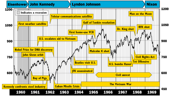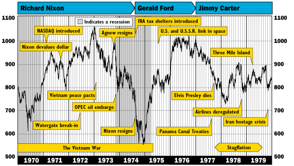 Následuje období ekonomické stagnace, spojené také s válkou ve Vietnamu. Dočasný pád burzy se odehrál v roce 1974, v době hospodářské recese, patrně v důsledku ropné krize.