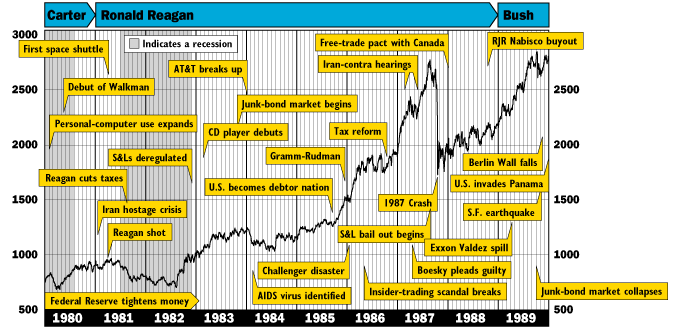 Počátek 80. let je spojen s restriktivní politikou Fedu, ale po jejím polevení přichází znovu býčí trh. Podívejte se nyní dobře na rok 1987. Index DJI v jeho průběhu prudce stoupá a pak přichází „černé pondělí” - 19. říjen 1987. Index DJI pokračoval v původní cestě roku 1986. Vypadá to, jakoby splaskla nějaká bublina.