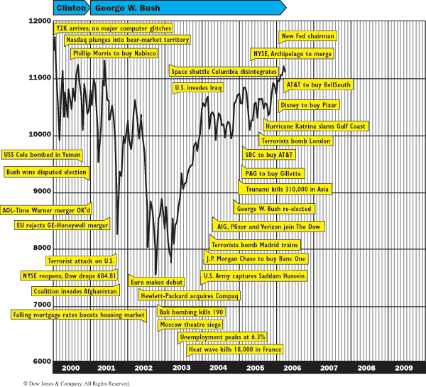 Nové tisíciletí však začíná jinak - stagnací následovanou dvouletým sestupem hodnot indexu DJI.