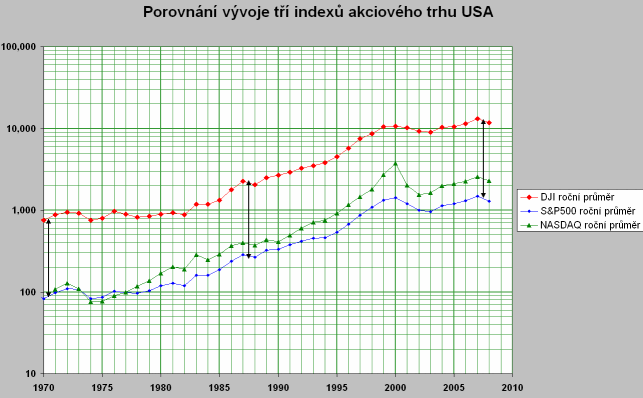 Naše volba indexu DJI je dána dlouhou dobou jeho sledování. Někdo by mohl namítnout, žže jiné indexy třeba odrážžejí stav ekonomiky USA věrněji. Pro ně je pak určen následující obrázek, který zachycuje vývoj tří indexů amerického akciového trhu v posledních 40 letech. Vedle indexu DJI zde najdete indexy S&P500 a NASDAQ: