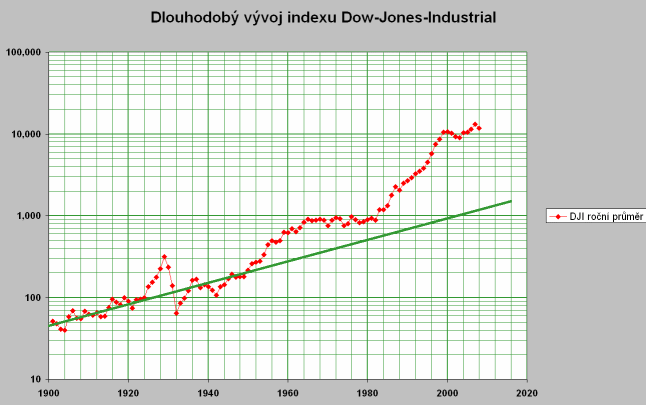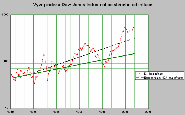 Pro osu hodnot indexu jsem zvolil logaritmické měřítko, které lépe odpovídá procentnímu nárůstu hodnot akcií a které umožžňuje lépe porovnávat chování exponenciálně se vyvíjejících procesů. Na obrázku si nemůžžete nevšimnout velké recese z let 1929-1932. Zelená čára pak znázorňuje ideální exponenciální proces, který dobře vystihuje chování indexu DJI v první polovině 20. století. Reálný vývoj DJI ve 2. polovině 20. století se pak od této křivky znatelně odchyluje.
