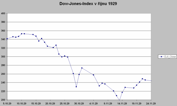 Od roku 1925 začíná období „nové éry”, býčího trhu, kdy akcie a s nimi index DJI začínají prudčeji stoupat. A hned vzápětí přichází „černý čtvrtek”, 24. říjen 1929, který odstartoval krach na burze v New Yorku. Detailní pohled na vývoj indexu DJI si dopřejeme později.