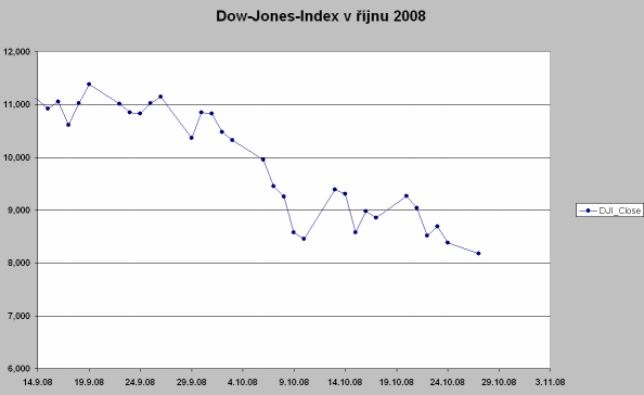 Podívejte se nyní na vývoj tohoto indexu od počátku 20. století (historická data indexu lze nalézt např. na www.yahoo.com). Jedná se o časovou řadu ročních průměrů - pro rok 2008 naleznete v grafu průměrnou hodnotu indexu za období I-X/2008).