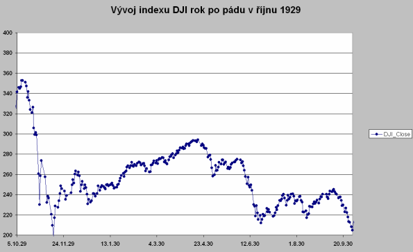 Ze srovnání vývoje indexu DJI v kritických obdobích si odhadnout další vývoj současné krize nedovolím. Poučný je totižž i následující obrázek, který zobrazuje chování indexu DJI celý jeden rok po pádu burzy v říjnu 1929, tedy do okamžžiku, kdy pak začal dvouletý, jižž pomalejší, ale o to trvalejší propad, svázaný s velkou hospodářskou krizí.