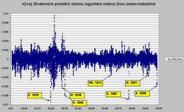Zajímejme se nyní o prudké změny indexu DJI v minulosti. K tomu si spočteme 30-denní průměry sklonu logaritmu DJI. Dostaneme následující obrázek: