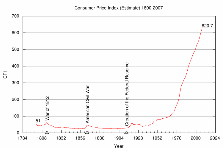 Proto se podívejme na dlouhodobý vývoj spotřebitelských cen v USA. Následující obrázek, vypůjčený z Wikipedie, zachycuje vývoj indexu CPI (100% v roce 1967). K dispozici máme reálné údaje od konce 18. století, takže je krásně vidět, žže se ceny v průběhu celého 19. století prakticky neměnily s výjimkou období válek.
