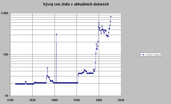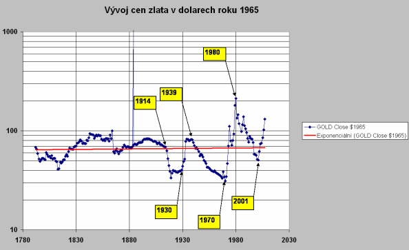 Vývoj cen zlata v dolarech roku 1965 (těsně před rokem 1971) nám poskytuje pohled daleko zajímavější. Přes veškeré snahy federální rezervní je totižž pro mne dost překvapivě patrné, žže se střední cena zlata v průběhu dvou set let příliš nemění. Svědčí o tom pokus proložžit očištěnými daty exponenciálu. Cena zlata má téměř konstantní trend. Jediným důsledkem odpoutání dolaru od „knížžecího zbožží” je větší cenový rozptyl, větší volatilita.